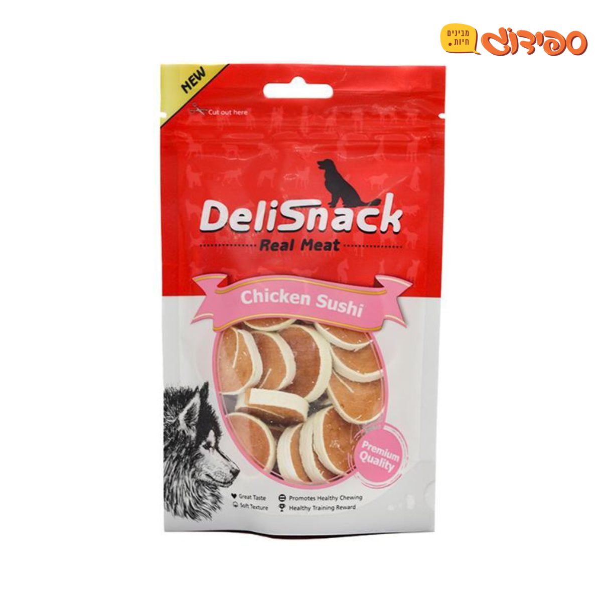 דליסנק חטיף סושי עוף. החטיף עשוי ממרכיבים איכותיים בלבד ועל בסיס עוף, בעל טעם נהדר, מתאים גם כחטיף כיפי לאילוף הכלב.