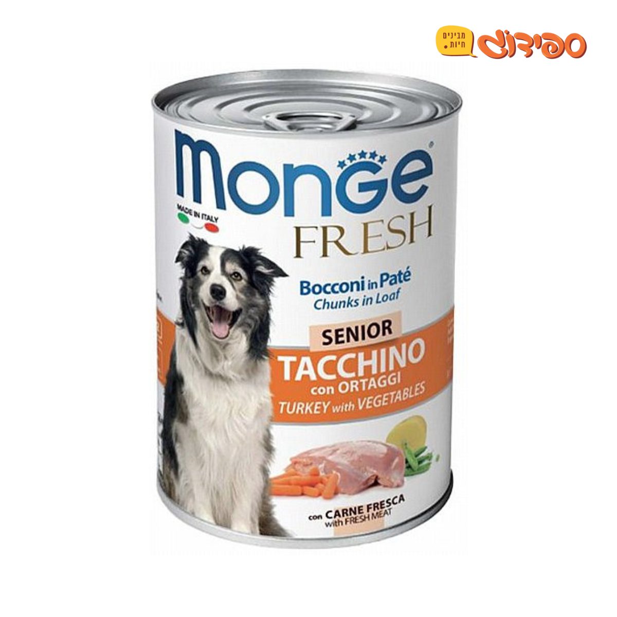 מונג` פרש הודו וירקות סניור לכלבים מבוגרים מעל 7 שנים, סידרת השימורים FRESH עם מתכון יייחודי טעים ומזין במיוחד מבית ענקית המזון מונג'!