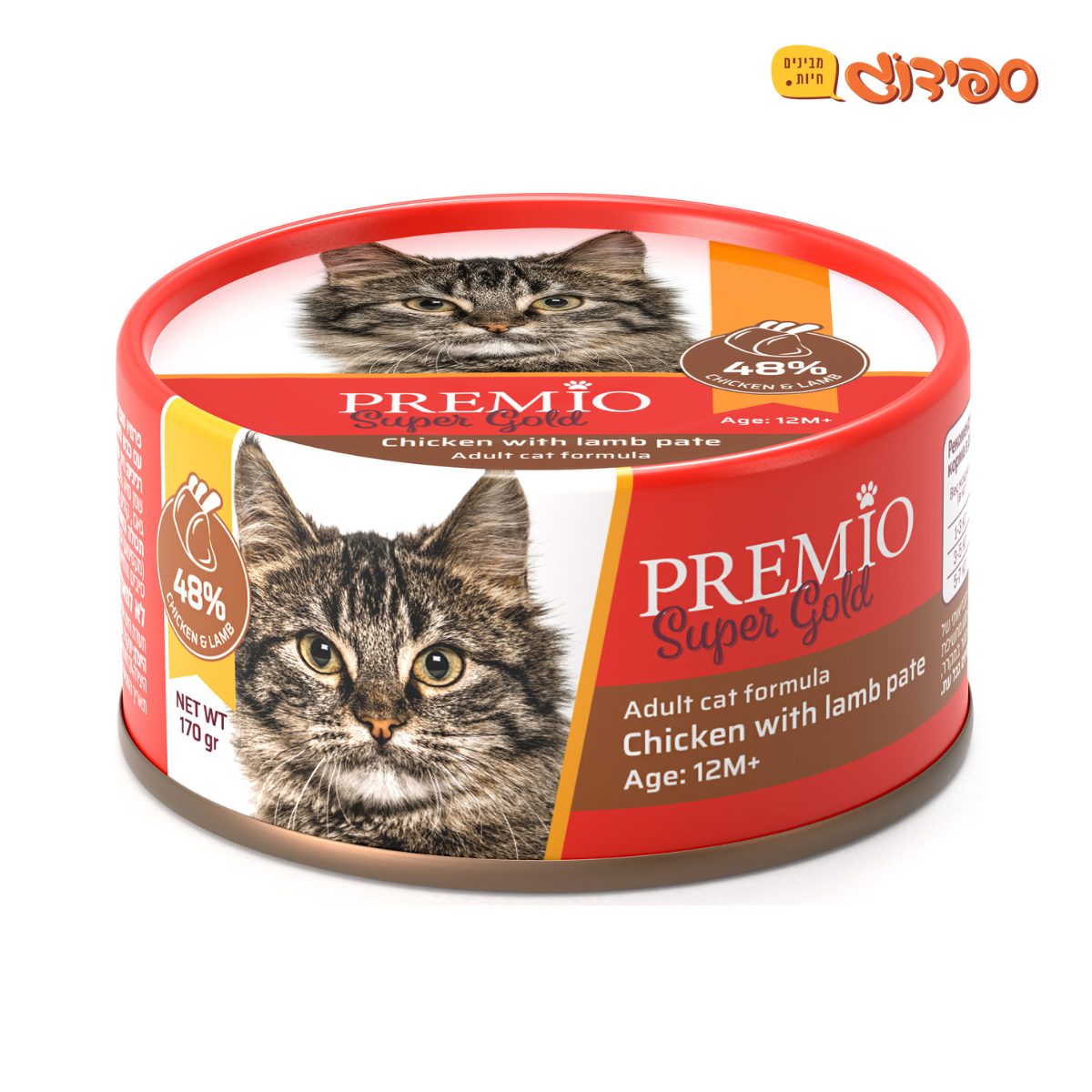 פרמיו סופר גולד שימורי מזון מלא ומאוזן לחתול בוגר עם עוף וכבש במרקם פטה