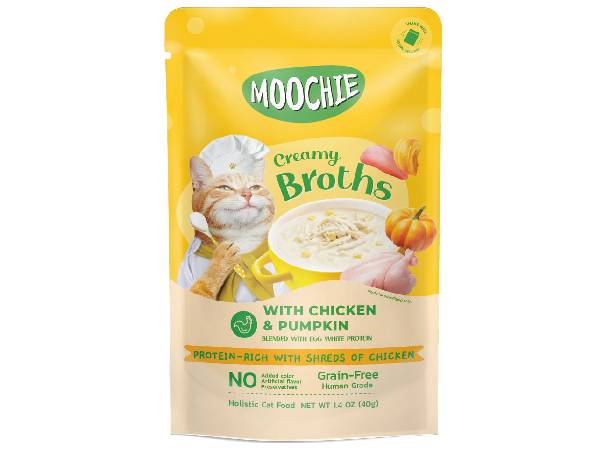 רכיבים: ציר עוף, חזה עוף, דלעת, עמילן טפיוקה, גליצין, טריקלציום פוספט, טאורין, גואר גאם, חלבון ביצה מיובש וויטמין E תכולה תזונתית באחוזים: חלבון מינ' 7% , שומן מינימום 0.5%, סיבים מקסימום 1%, לחות מקסימום 90%. אנרגיה מטבולית 40 קק"ל / 100 גרם, 16 קק"ל / 40 גרם.
