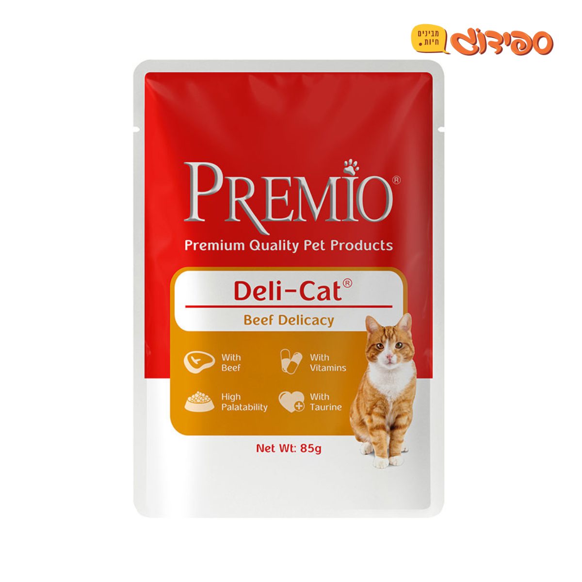 פרמיו שימורי מזון מלא ומאוזן לחתול בוגר עם נתחי בקר ברוטב